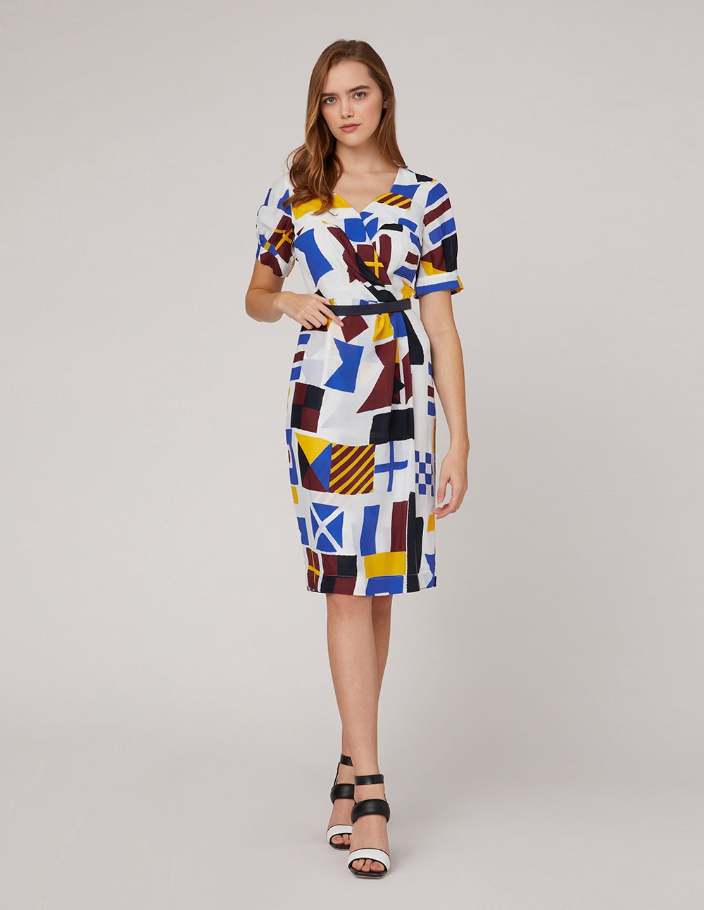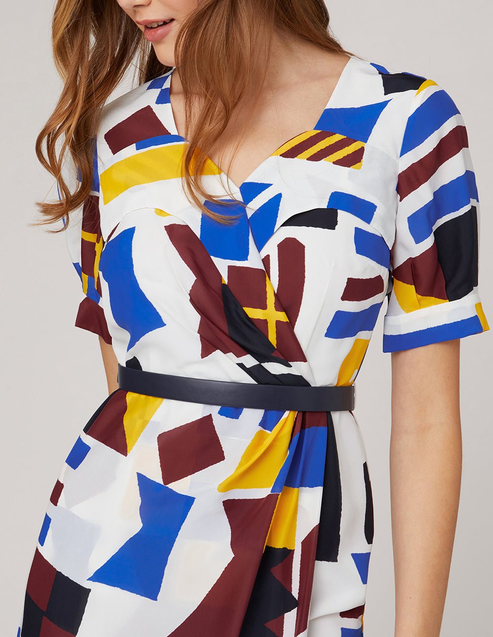 The V-neck crisscross pleated straight body and hip design combines with a bright colour block silk printing. is elegant. sexy and artistic; it is very suitable for summer wear