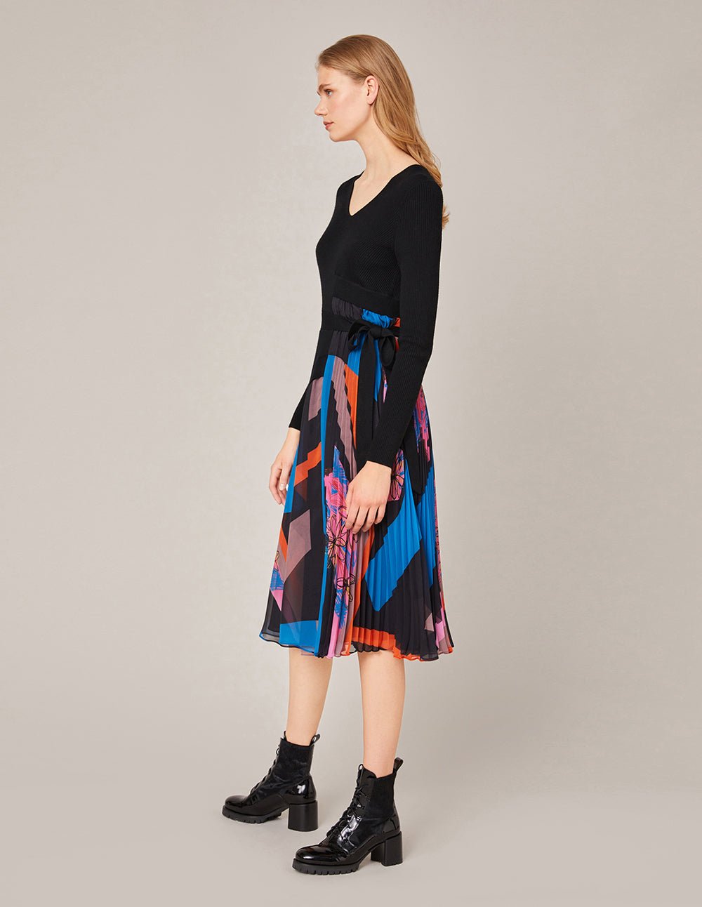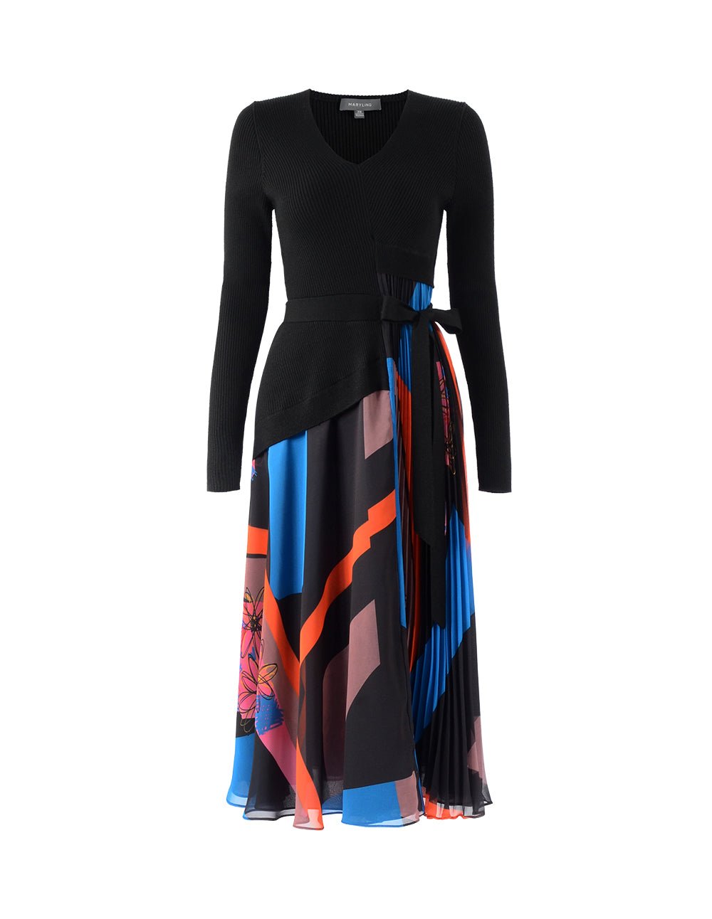 V-neck midi dress crafted from asymmetrical ribbed-knit fabric combined with an abstract flared print georgette dress. It of a kind piece for high-impact and chic dressing.