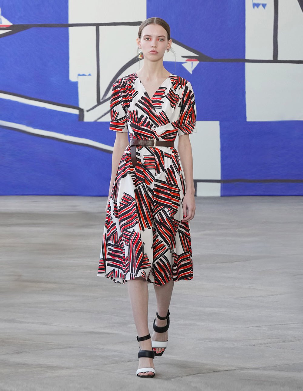 This dress is crafted from crisp and natural precision cotton. illuminated by an artistic abstract brushstroke print. with puffed sleeves and a crossover V-neck that adds a touch of Italian flair to your summer look.